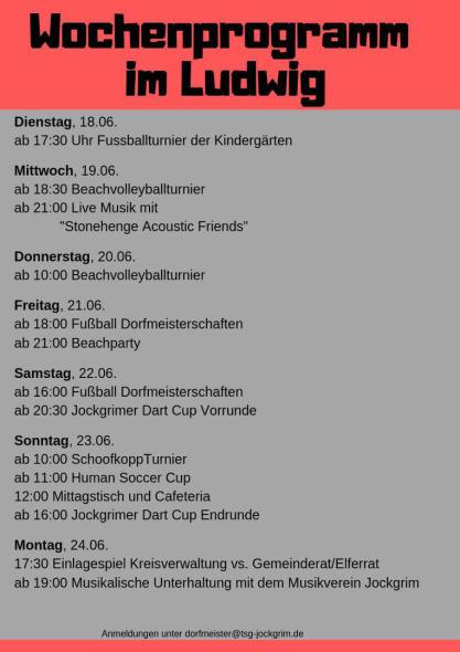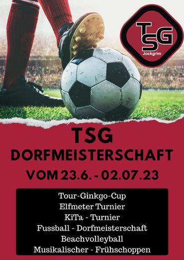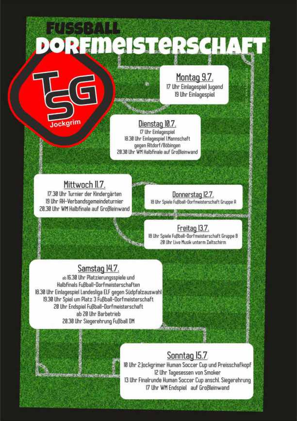 Montag 1.7., ab 18 Uhr Spiele der Fußball-Dorfmeisterschaft und Public Viewing im Zeltschirm: EM-Achtelfinale Dienstag 2.7., ab 17.30 Uhr Spiele der Fußball-Dorfmeisterschaft und Public Viewing im Zeltschirm: EM-Achtelfinale Trainingsauftakt und Teamvorstellung Aktive Saison 24/25 Mittwoch 3.7.24, ab 17 Uhr Fußball-Kindergartenturnier Donnerstag 4.7., ab 18 Uhr Spiele der Fußball-Dorfmeisterschaft Freitag 5.7. Ruhetag Samstag 6.7., ab 17.30 Uhr Spiele der Fußball-Dorfmeisterschaft und Public Viewing im Zeltschirm: EM-Viertelfinale Sonntag 7.7. 10.30 Uhr Schau-Training Tanzstudio Jussara 13.00 Uhr Einlagespiel B-Jugend, SG 1920 Rheinzabern/Jockgrim - TSG 1849 Deidesheim 15.00 Uhr Elfmeter-Turnier: Maximal 2 aktive Fussballer pro Team. Frauen- oder Mixed-Teams sind erwünscht. Anmeldung an dorfmeister[at]tsg-jockgrim.de 18.00 Uhr Einlagespiel Herren, TSG Jockgrim - SV Rülzheim